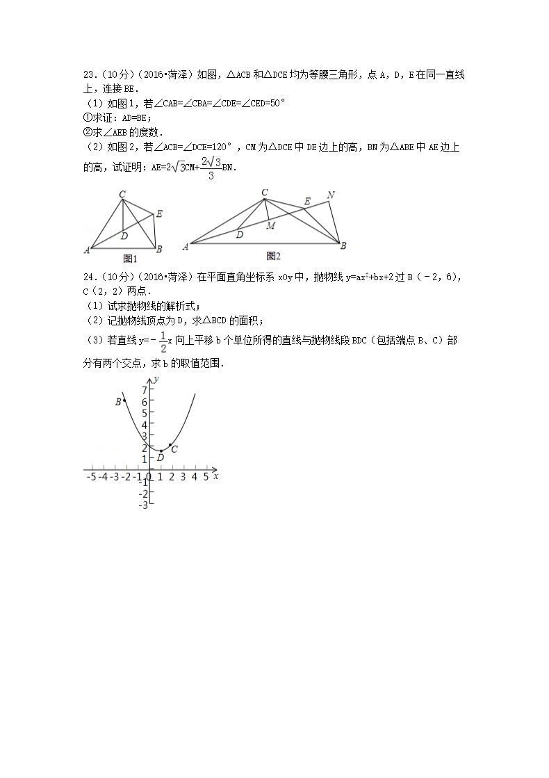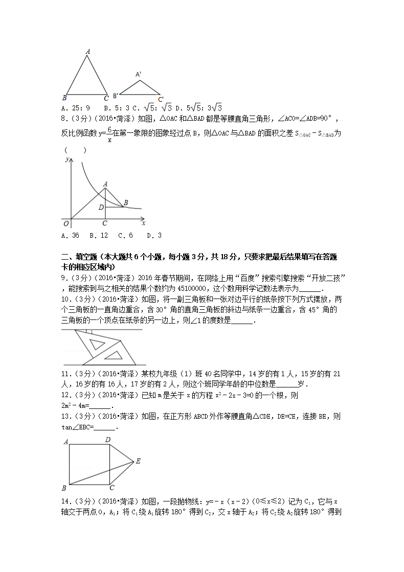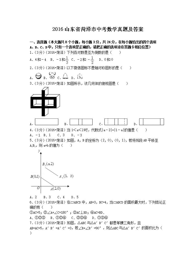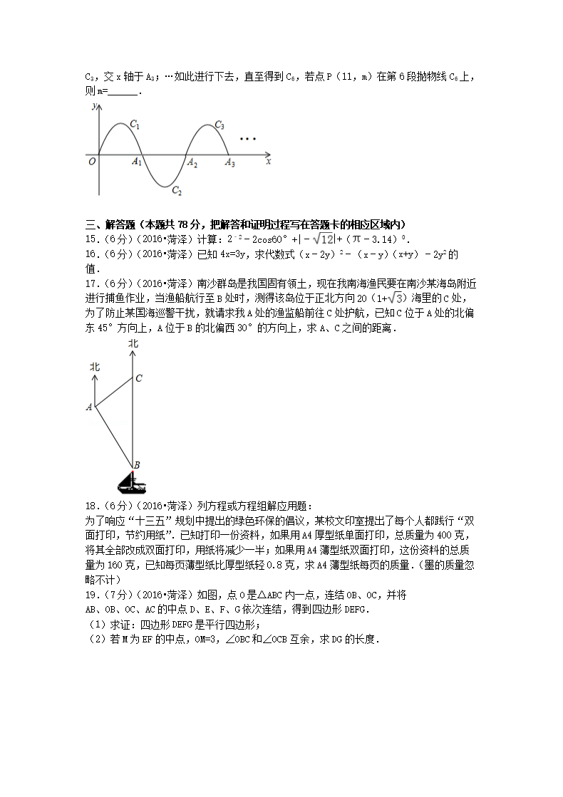 【文档名称】 2016山东省菏泽市中考数学真题及答案(Word版).doc