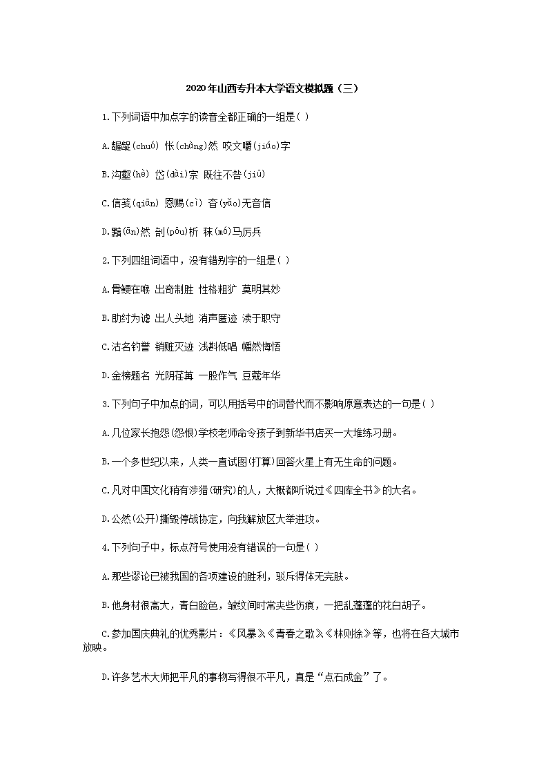 【文档名称】 2020年山西专升本大学语文模拟题三套(Word版).doc