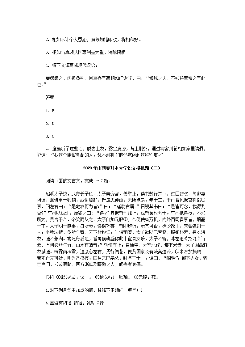 【文档预览】 无忧考网整理发布2020年山西专升本大学语文模拟题三套(Word版),前五页预览如下: