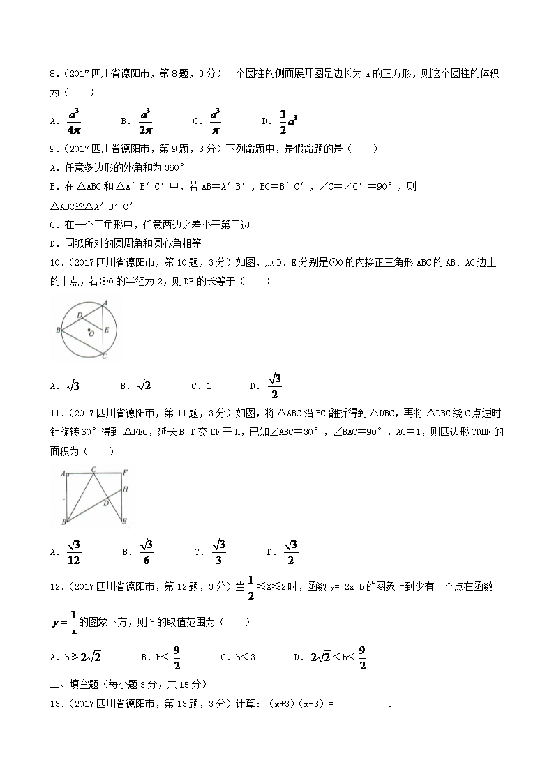 【文档名称】 2017年四川省德阳市中考数学真题及答案(Word版).doc