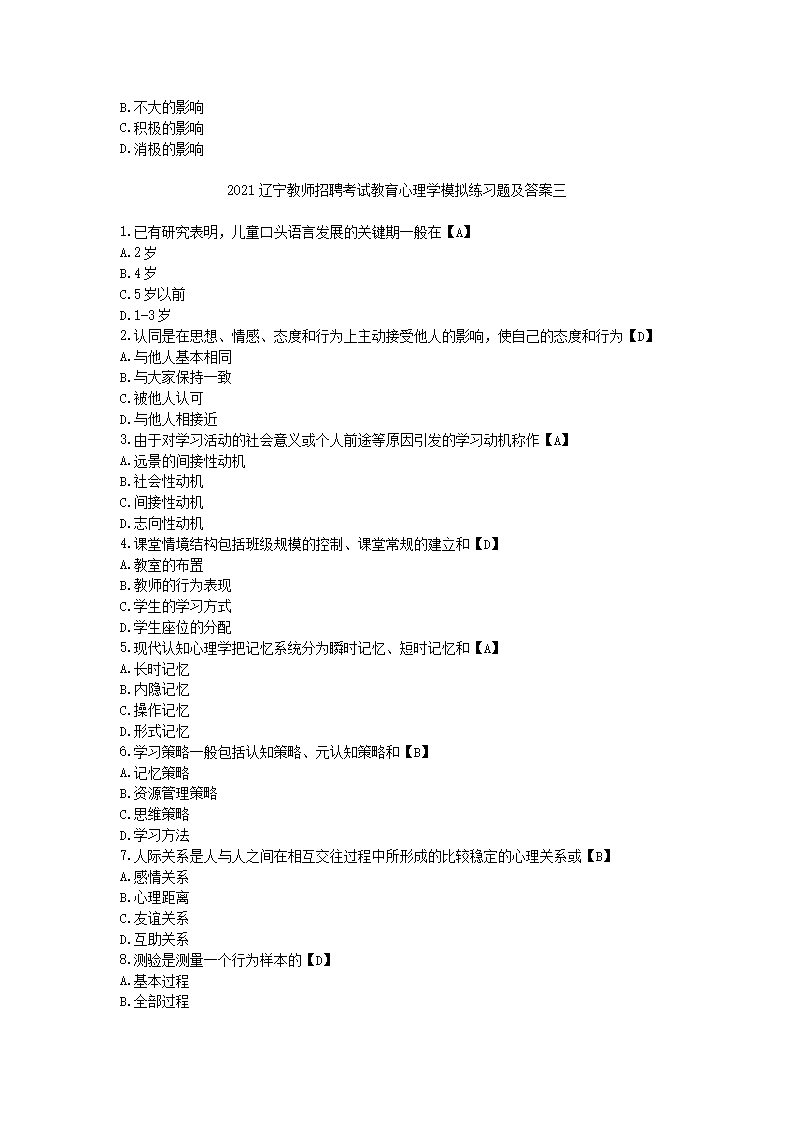 【文档预览】 无忧考网整理发布2021辽宁教师招聘考试教育心理学模拟练习题及答案五套(Word版),前五页预览如下: