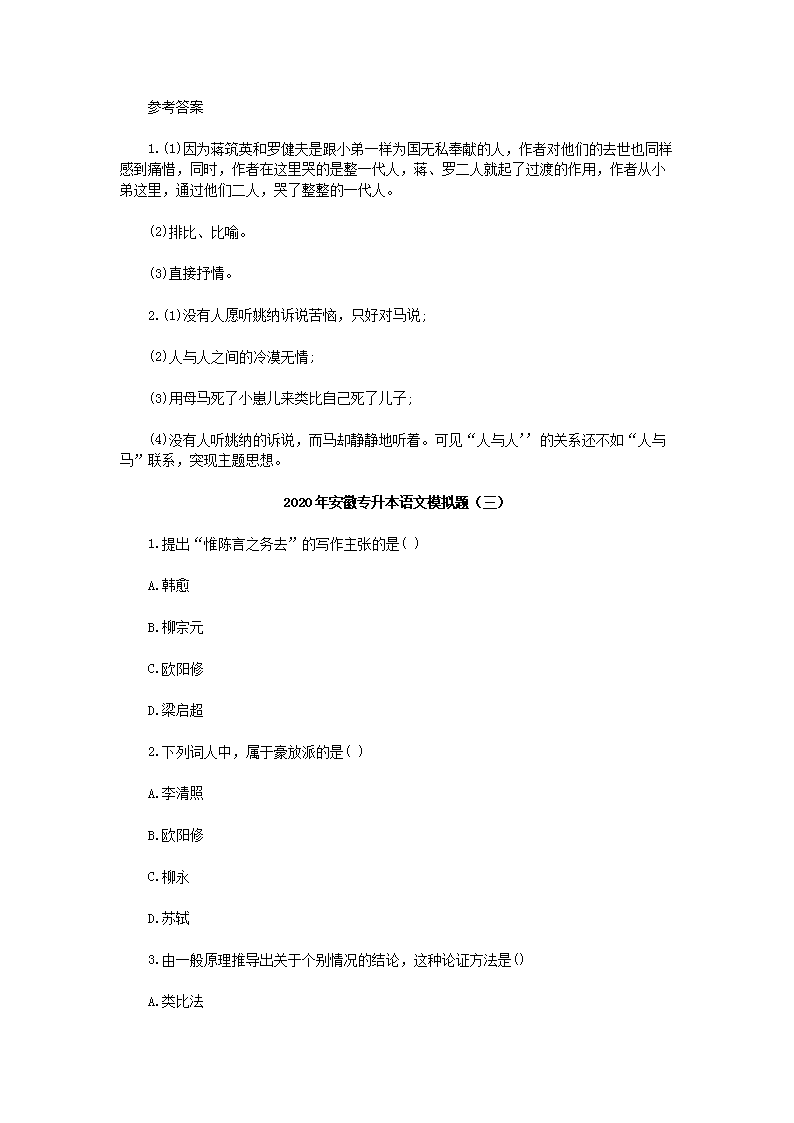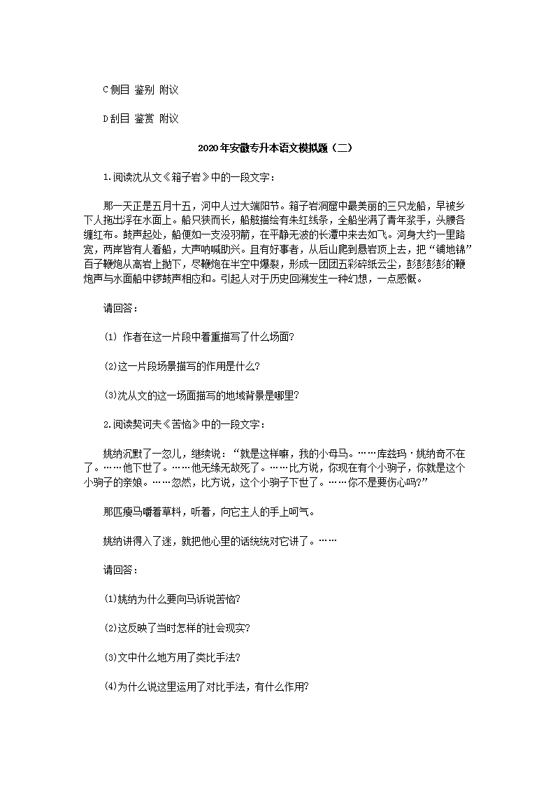 【文档名称】 2020年安徽专升本语文模拟题三套(Word版).doc