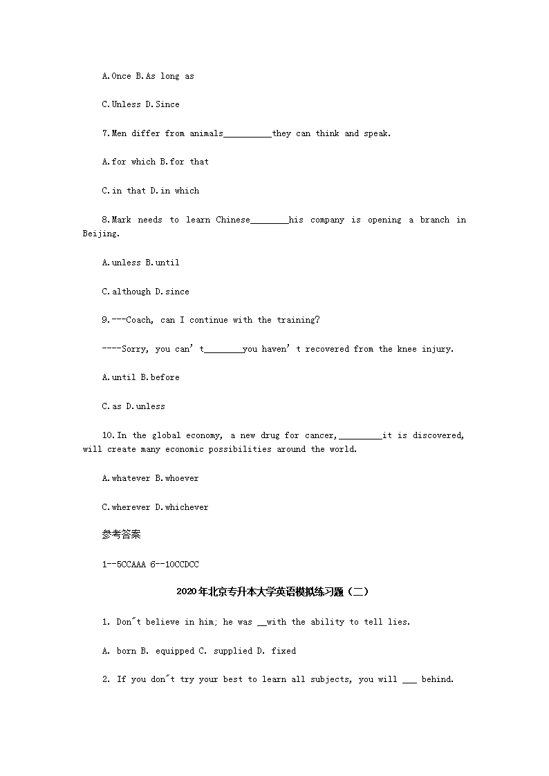 【文档预览】 无忧考网整理发布2020年北京专升本大学英语模拟练习题三套(Word版),前五页预览如下: