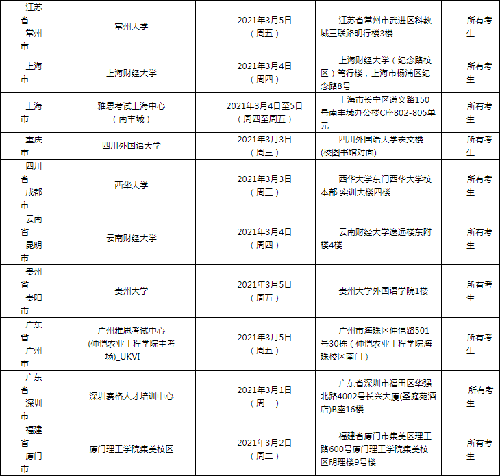 接英国文化教育协会通知,报考2021年3月6日雅思考试的考生口语安排如下,供广大考生参考。请按照报名网站公布的准考证打印时间登录雅思考试报名网站查询您的口试安排,打印准考证并以准考证信息为准。