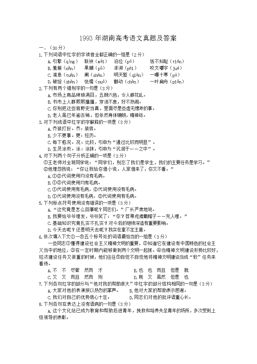 【文档名称】 1993年湖南高考语文真题及答案(Word版).doc