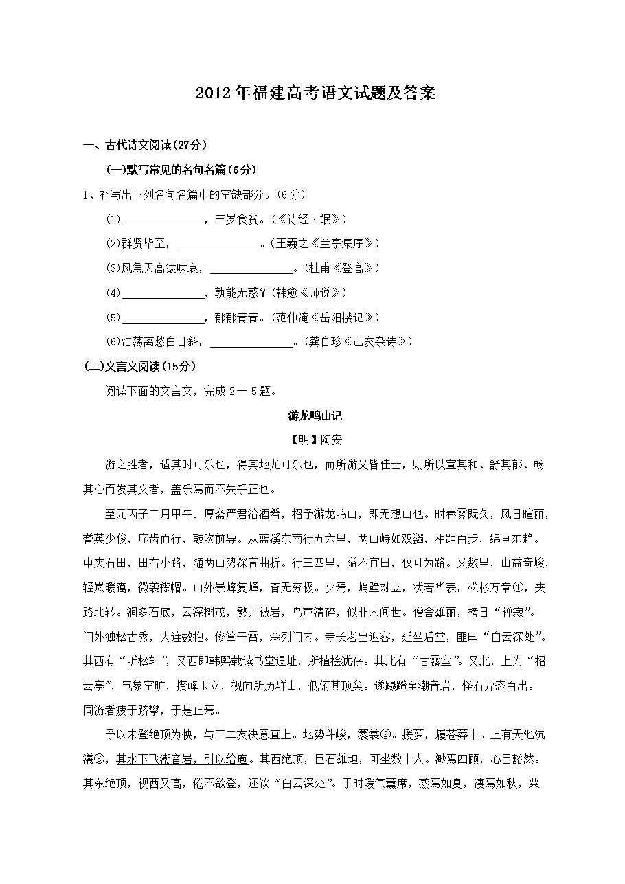 【文档名称】 2012年福建高考语文试题及答案(Word版).doc