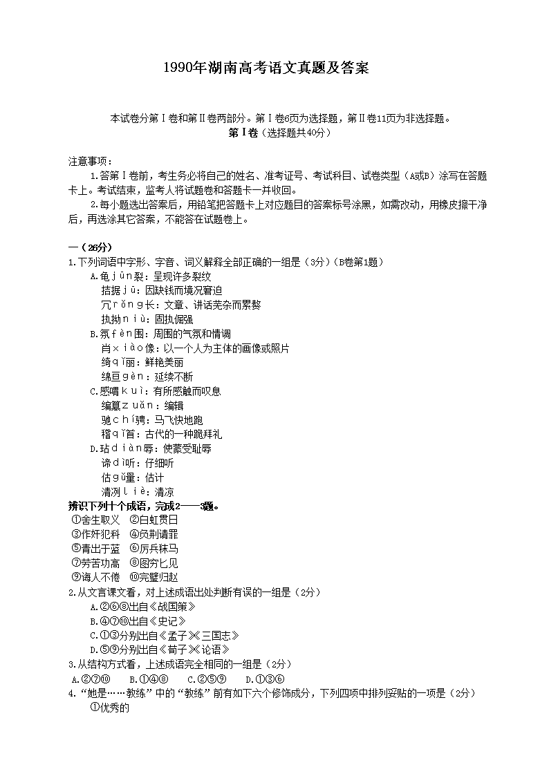 【文档名称】 1990年湖南高考语文真题及答案(Word版).doc