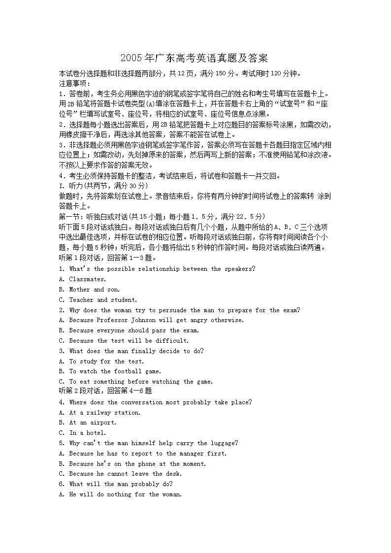 【文档预览】 无忧考网整理发布2005年广东高考英语真题及答案(Word版),前五页预览如下: