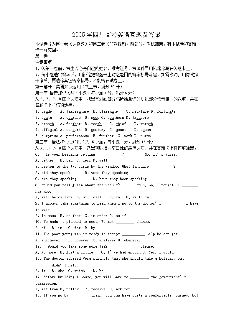 【文档名称】 2005年四川高考英语真题及答案(Word版).doc