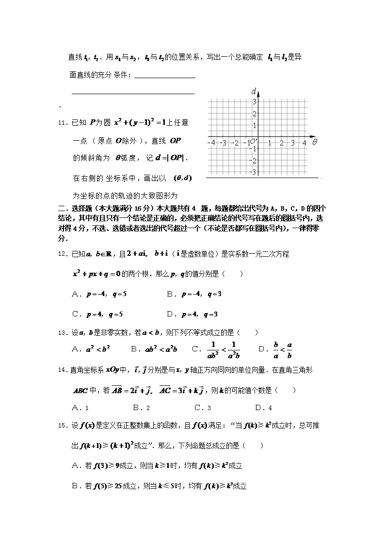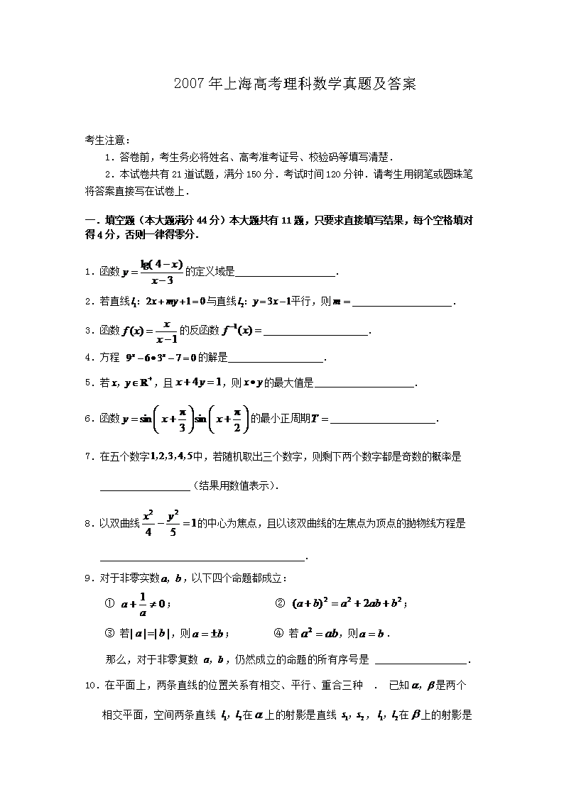 【文档名称】 2007年上海高考理科数学真题及答案(Word版).doc