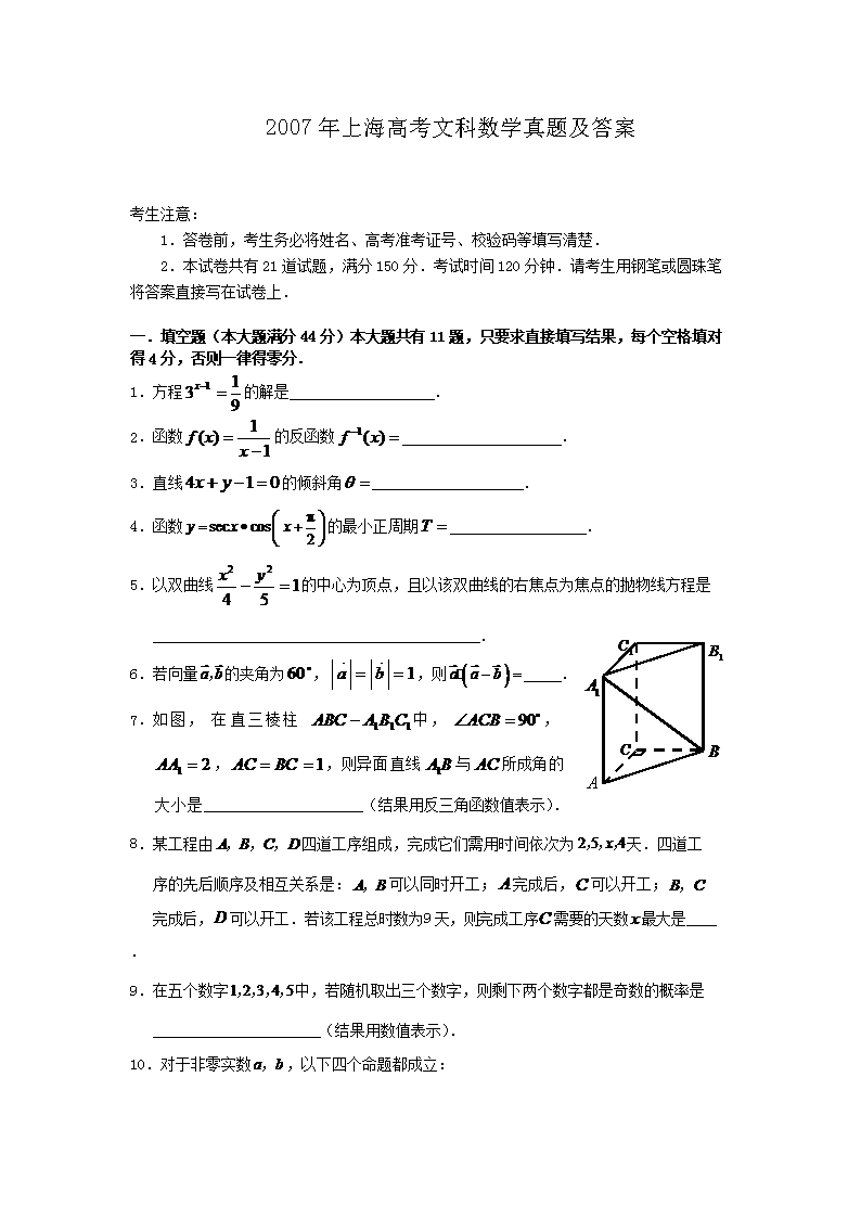 【文档名称】 2007年上海高考文科数学真题及答案(Word版).doc