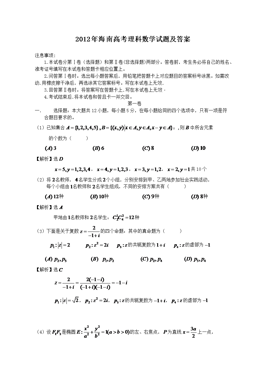 【文档名称】 2012年海南高考理科数学试题及答案(Word版).doc