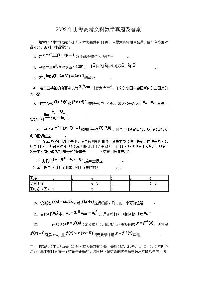 【文档名称】 2002年上海高考文科数学真题及答案(Word版).doc