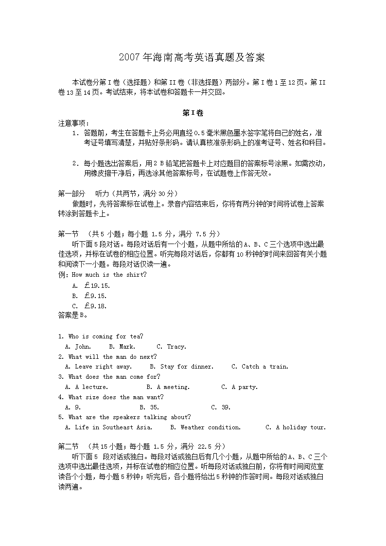 【文档名称】 2007年海南高考英语真题及答案(Word版).doc