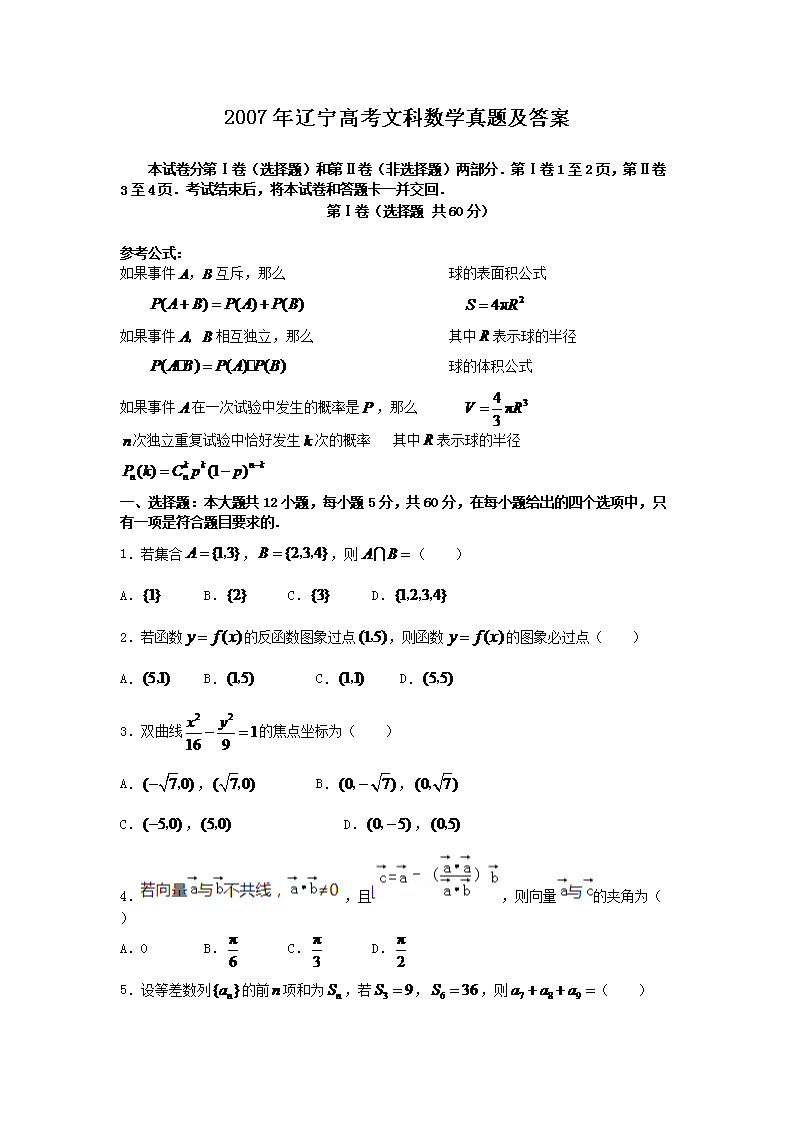 【文档预览】 无忧考网整理发布2007年辽宁高考文科数学真题及答案(Word版),前五页预览如下: