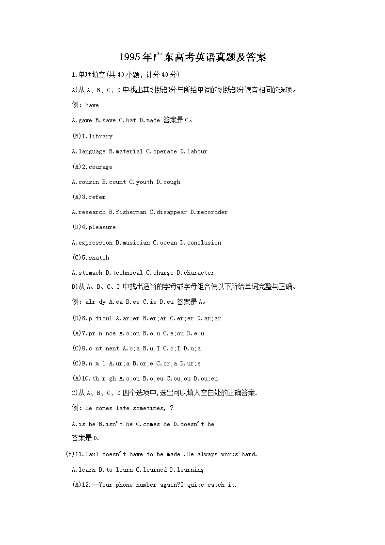 【文档名称】 1995年广东高考英语真题及答案(Word版).doc