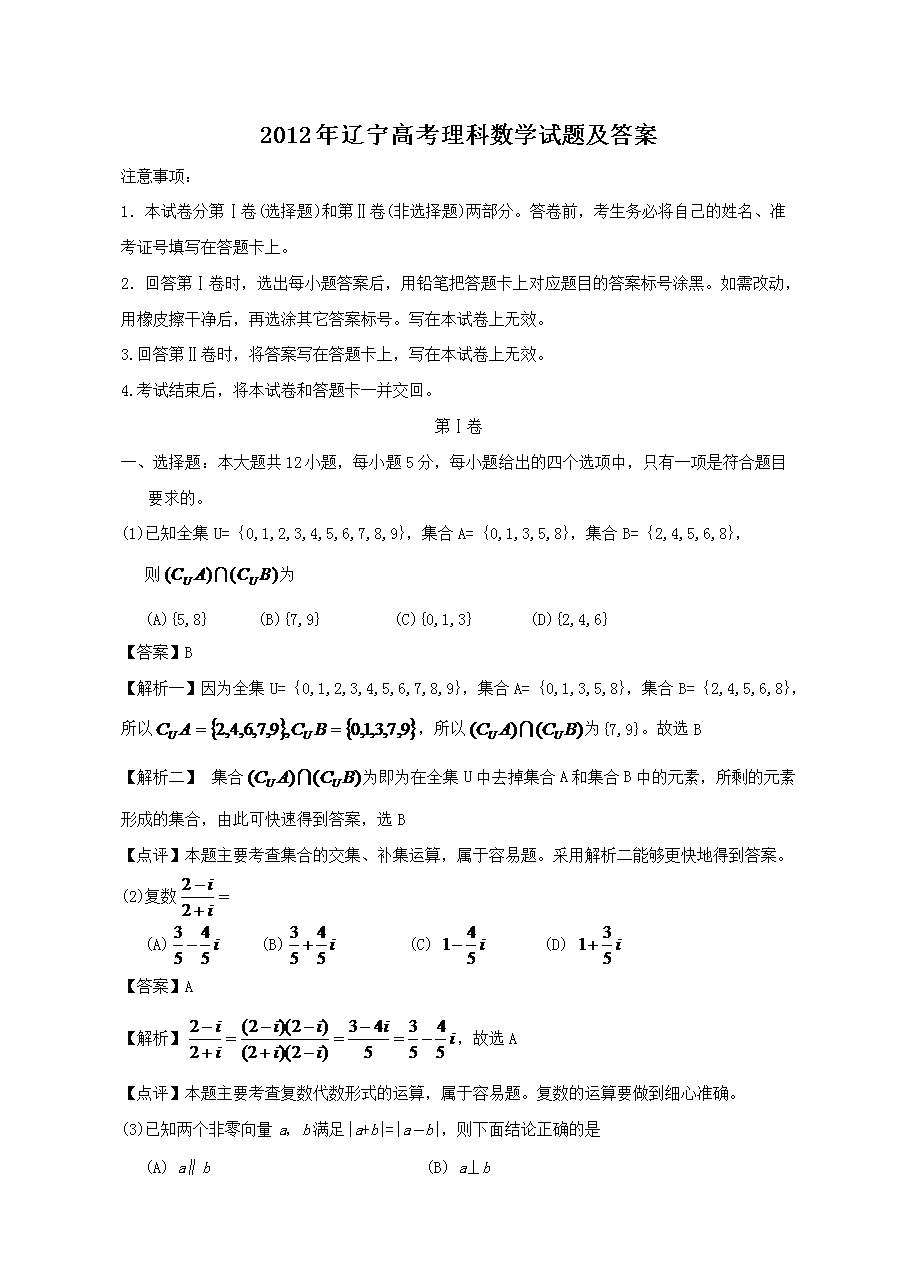【文档预览】 无忧考网整理发布2012年辽宁高考理科数学试题及答案(Word版),前五页预览如下:
