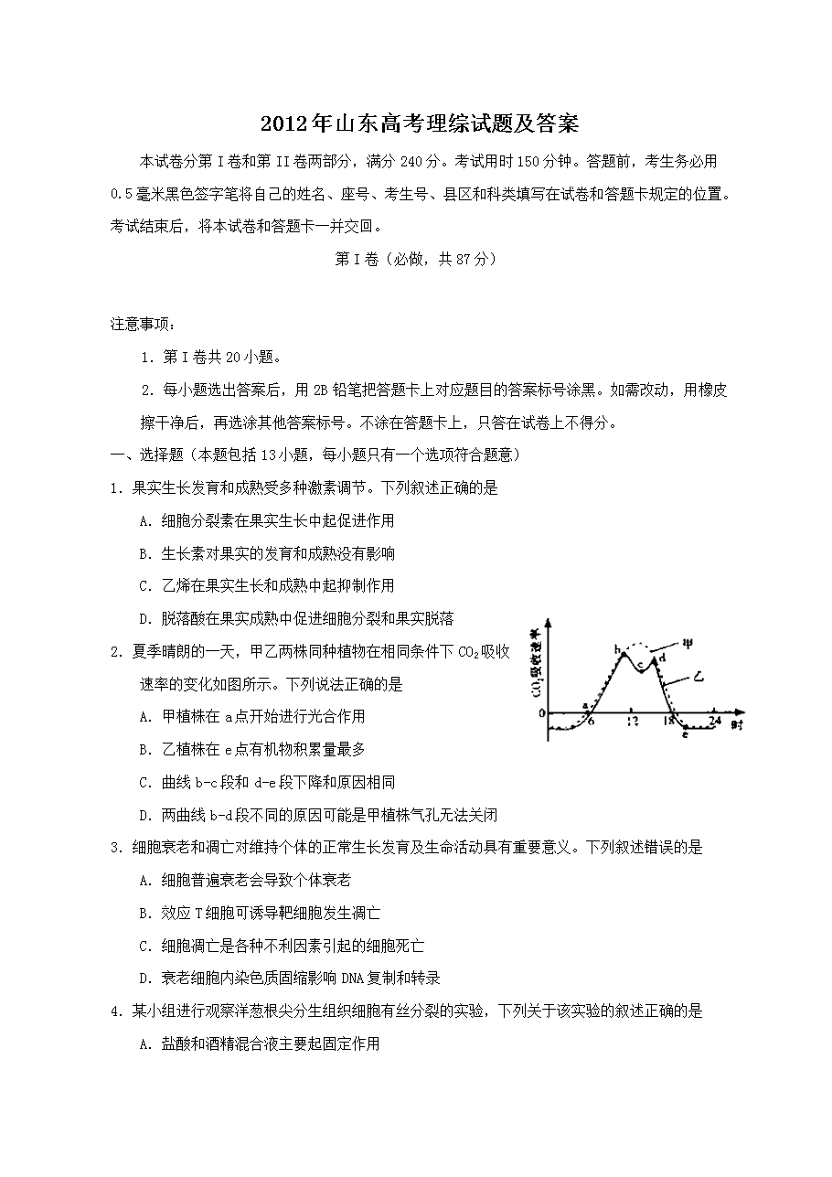 【文档名称】 2012年山东高考理综试题及答案(Word版).doc
