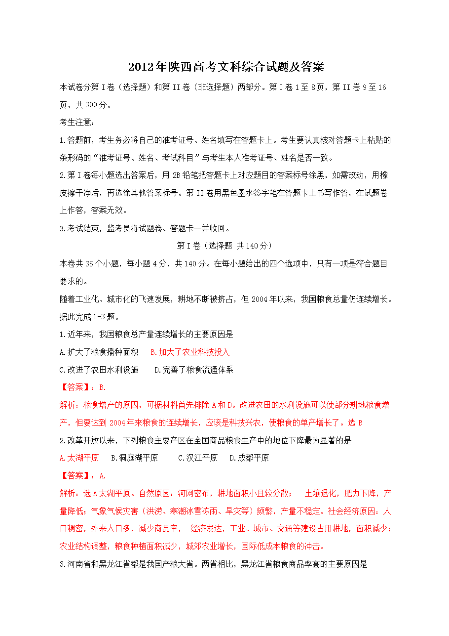 【文档名称】 2012年陕西高考文综试题及答案(Word版).doc