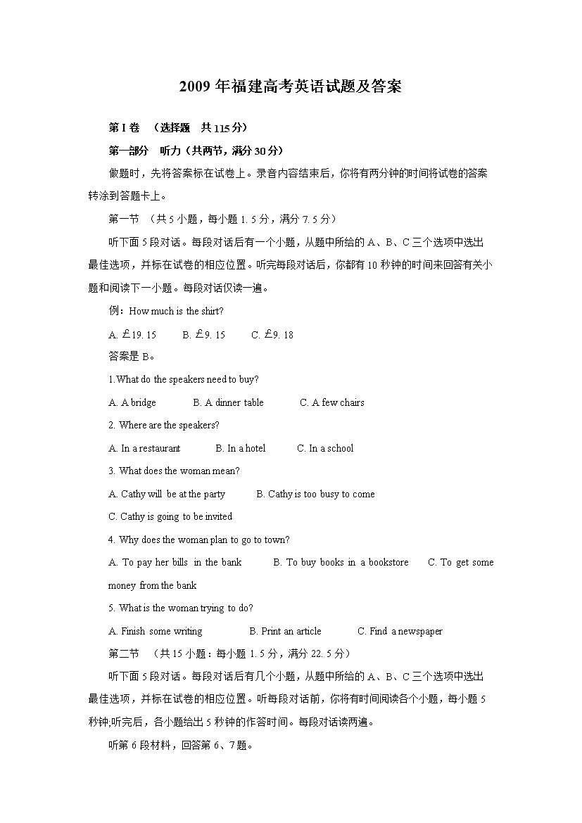 【文档预览】 无忧考网整理发布2009年福建高考英语试题及答案(Word版),前五页预览如下: