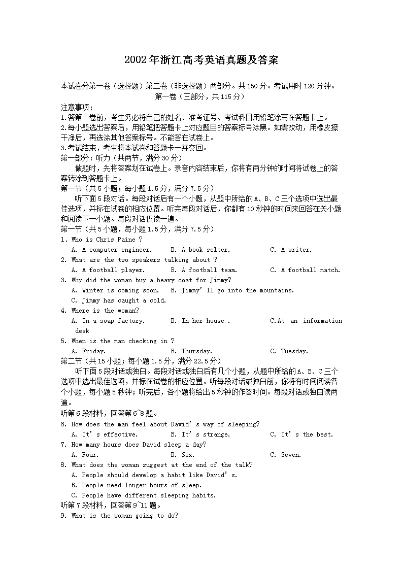 【文档名称】 2002年浙江高考英语真题及答案(Word版).doc