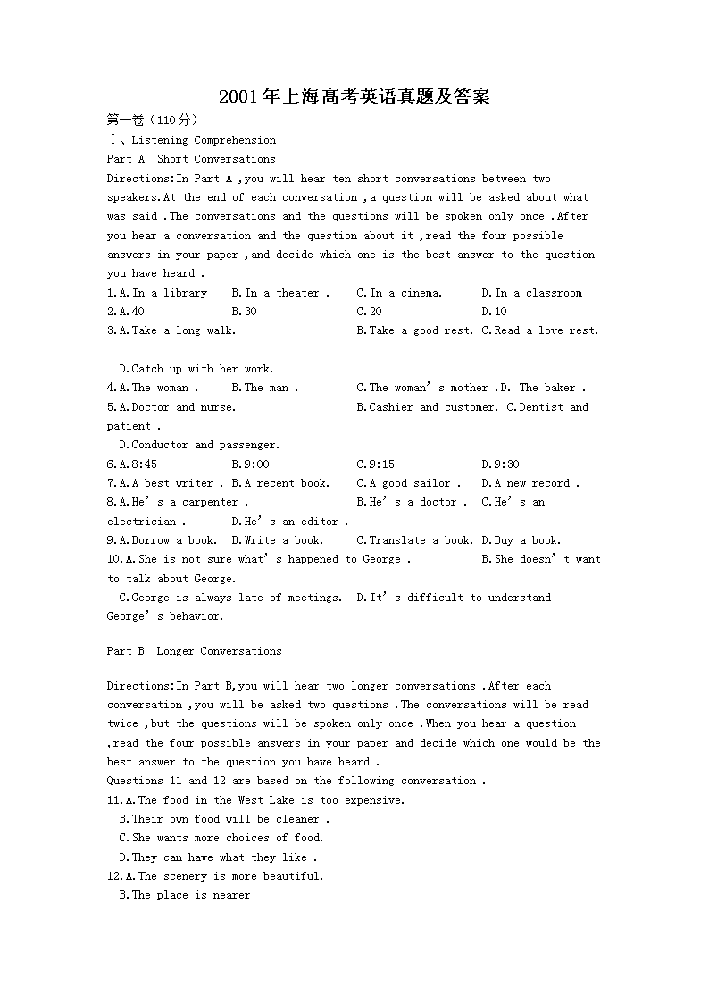 【文档名称】 2001年上海高考英语真题及答案(Word版).doc