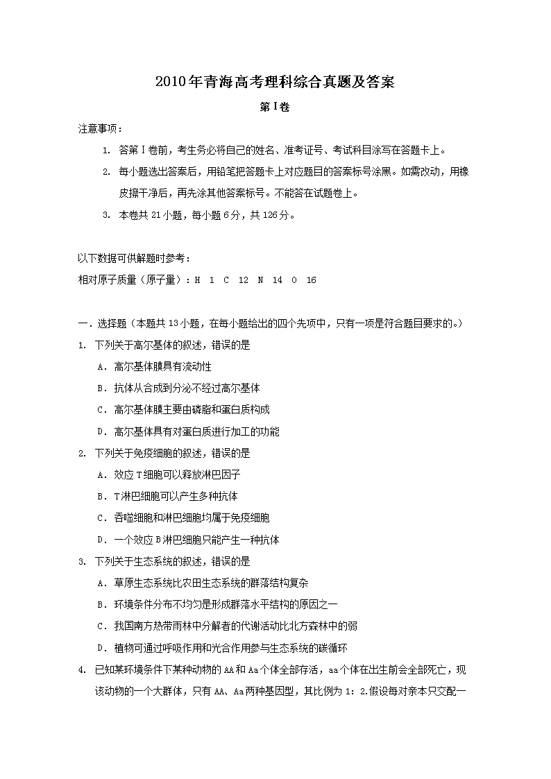 【文档预览】 无忧考网整理发布2010年青海高考理科综合真题及答案(Word版),前五页预览如下: