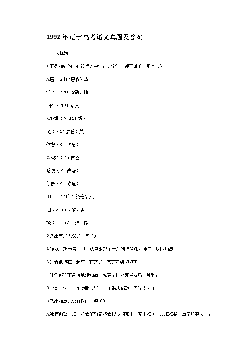 【文档名称】 1992年辽宁高考语文真题及答案(Word版).doc