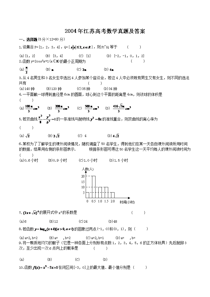 【文档名称】 2004年江苏高考数学真题及答案(Word版).doc