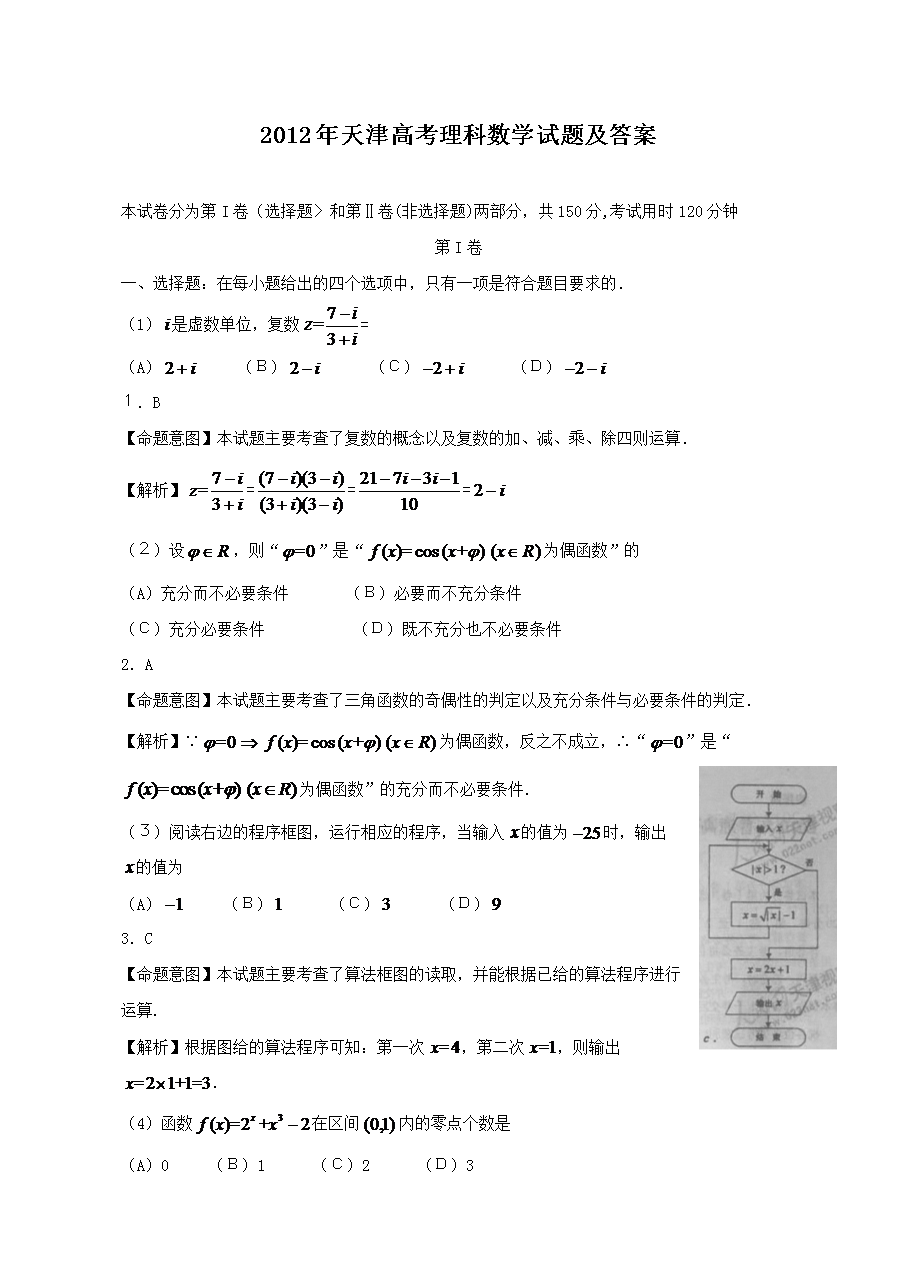 【文档名称】 2012年天津高考理科数学试题及答案(Word版).doc