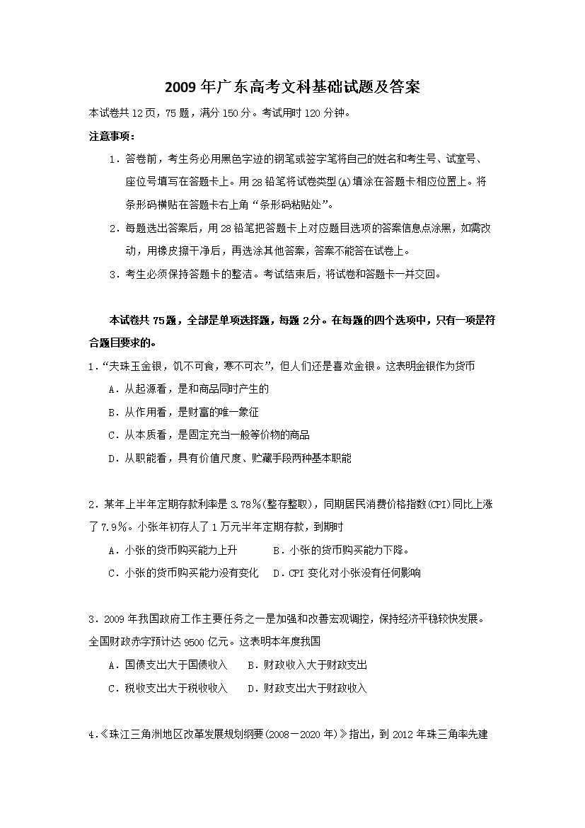 【文档名称】 2009年广东高考文科基础试题及答案(Word版).doc