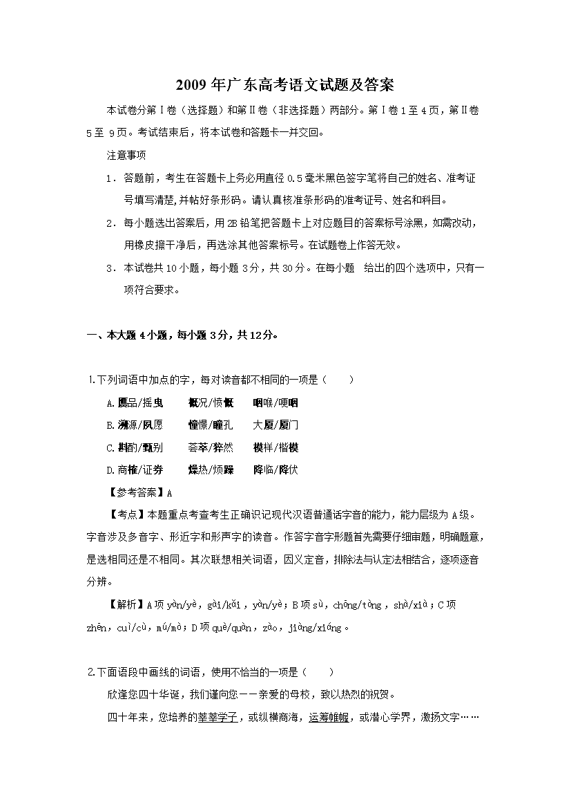 【文档名称】 2009年广东高考语文试题及答案(Word版).doc