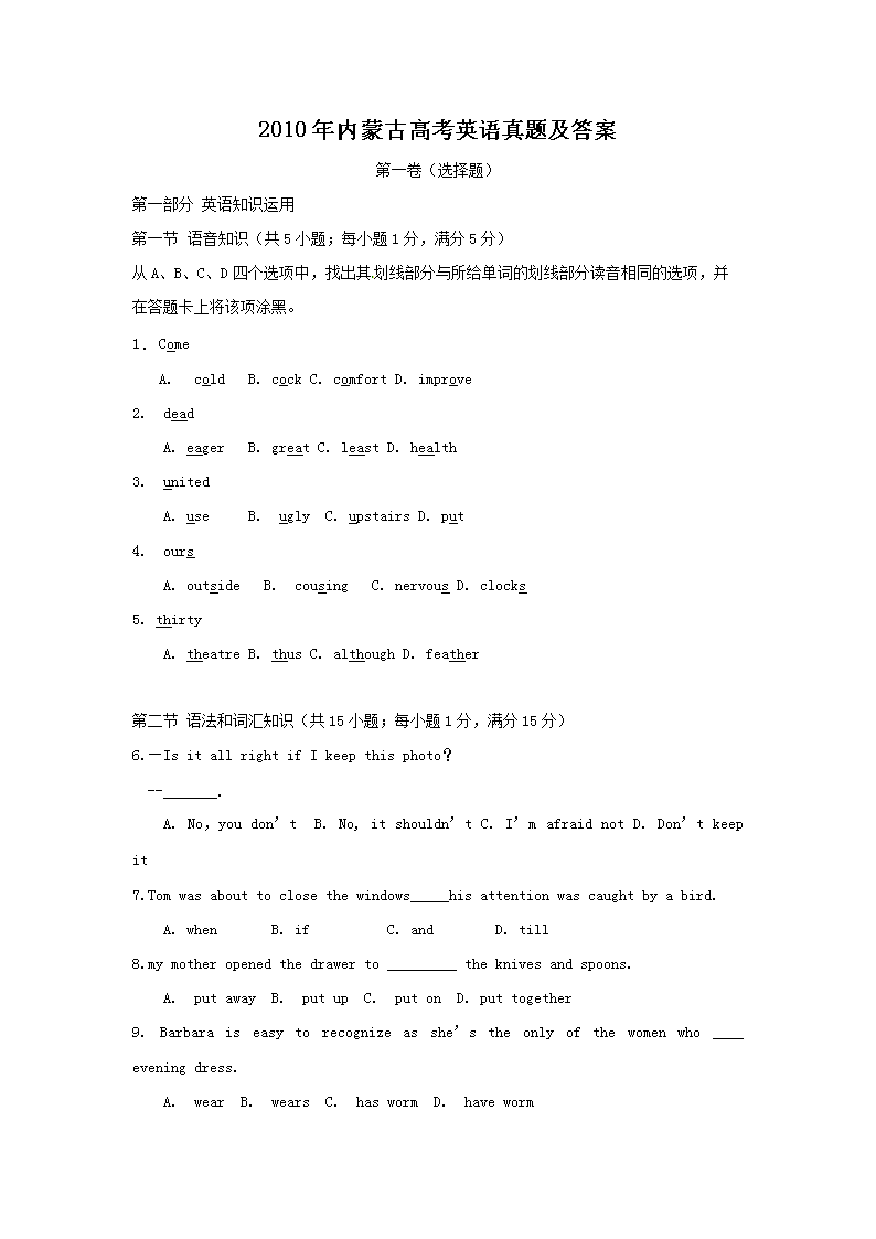 【文档预览】 无忧考网整理发布2010年内蒙古高考英语真题及答案(Word版),前五页预览如下: