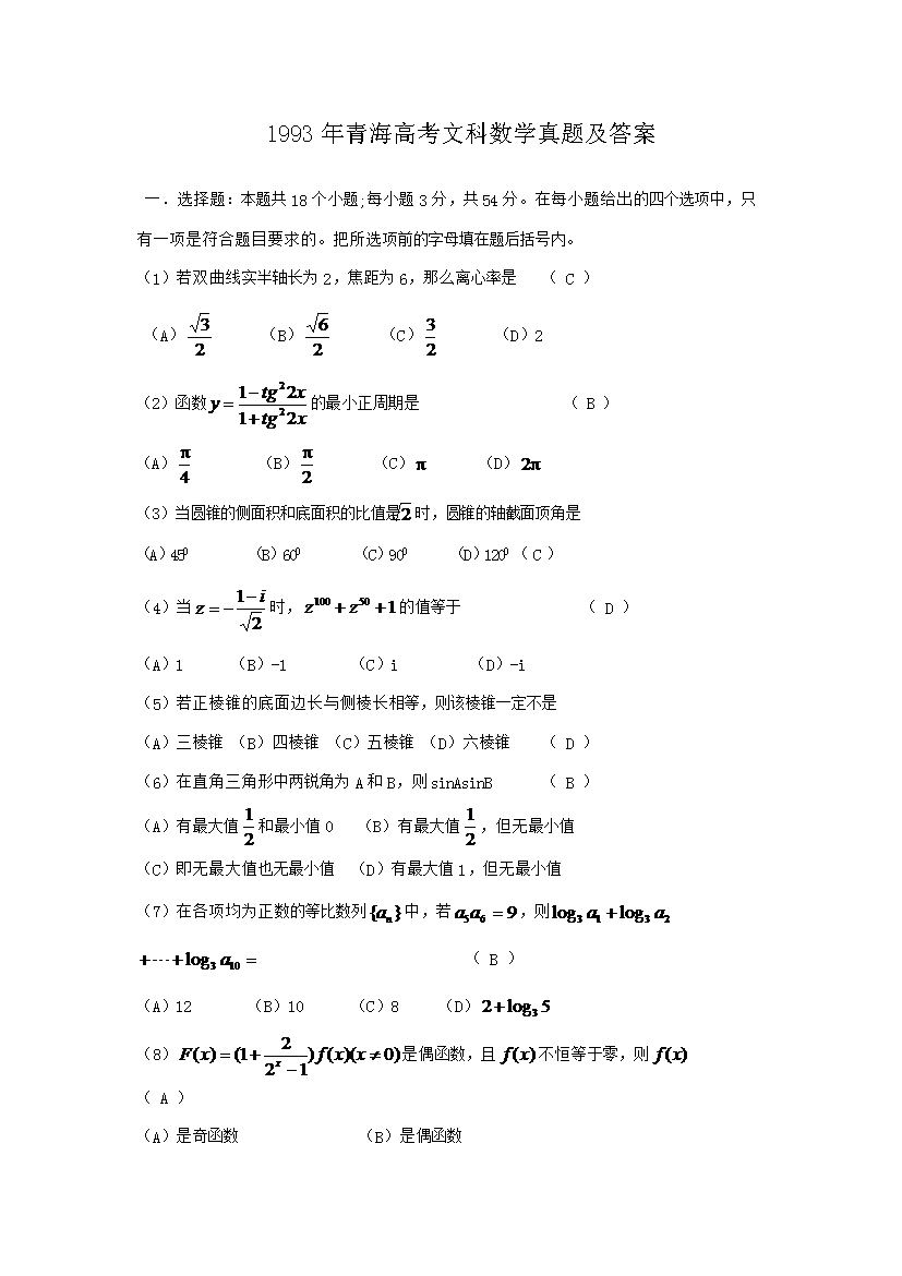 【文档名称】 1993年青海高考文科数学真题及答案(Word版).doc
