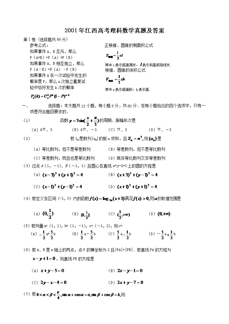 【文档名称】 2001年江西高考理科数学真题及答案(Word版).doc