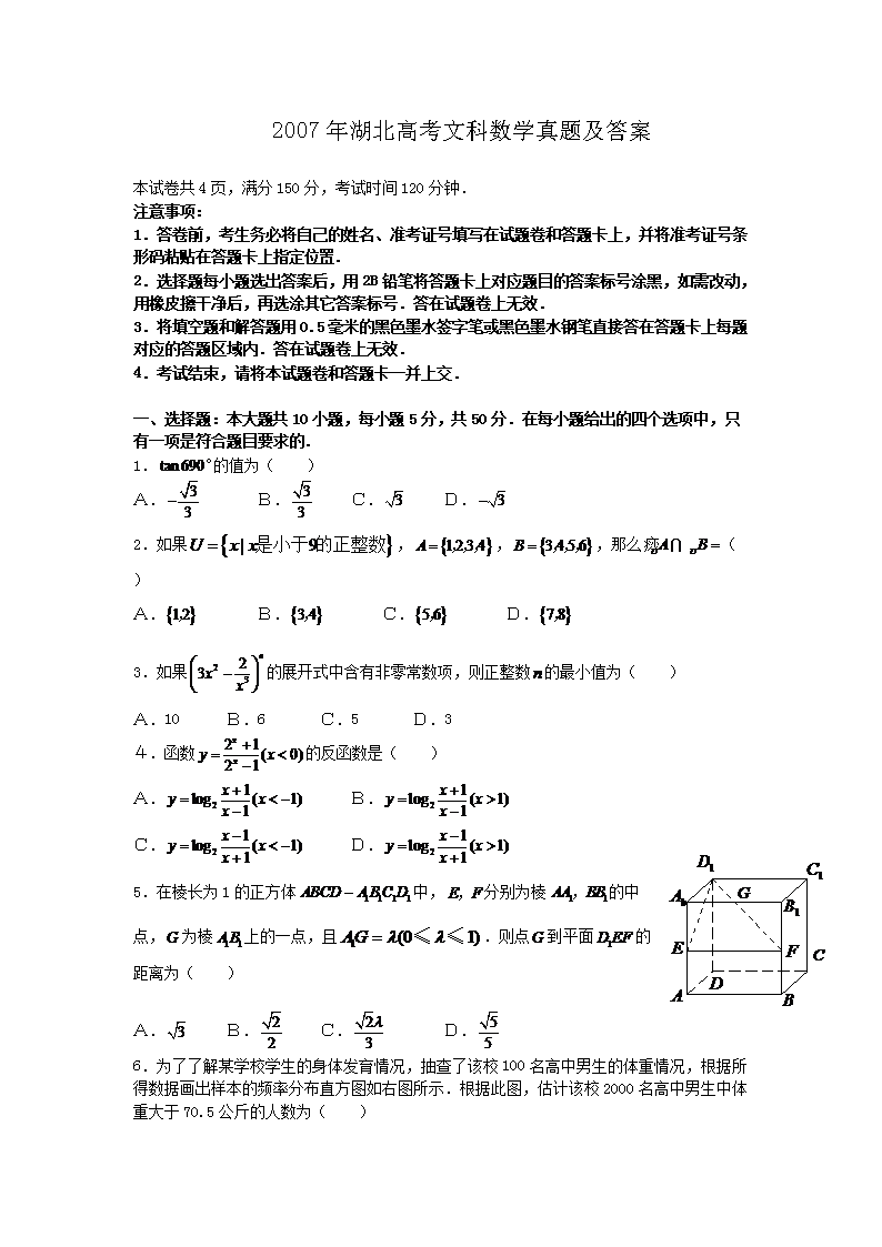 【文档名称】 2007年湖北高考文科数学真题及答案(Word版).doc