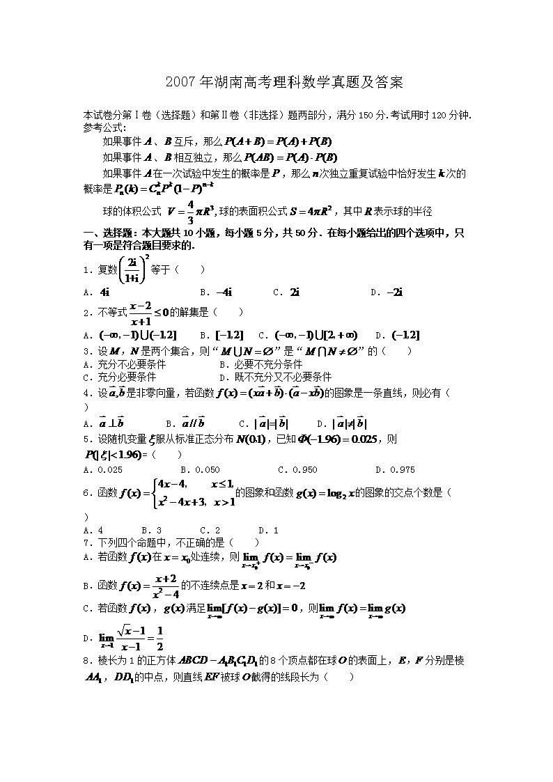 【文档名称】 2007年湖南高考理科数学真题及答案(Word版).doc