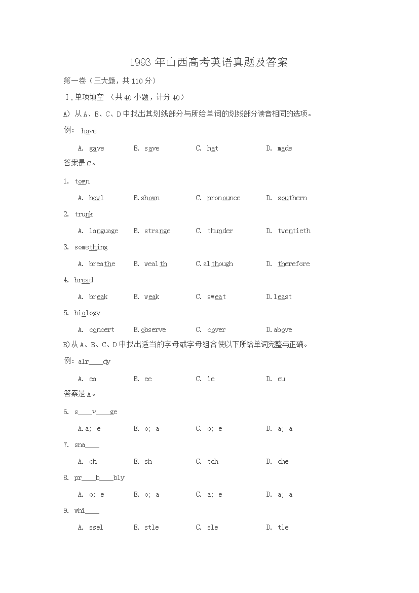 【文档名称】 1993年山西高考英语真题及答案(Word版).doc