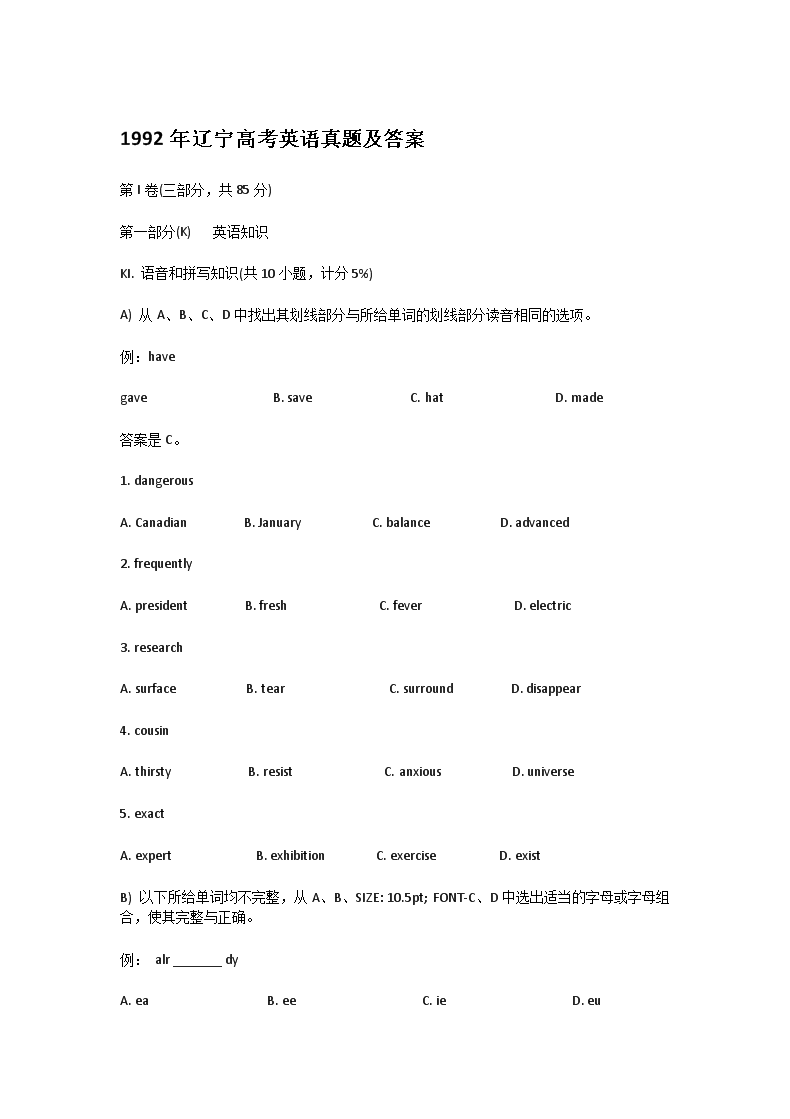 【文档名称】 1992年辽宁高考英语真题及答案(Word版).doc