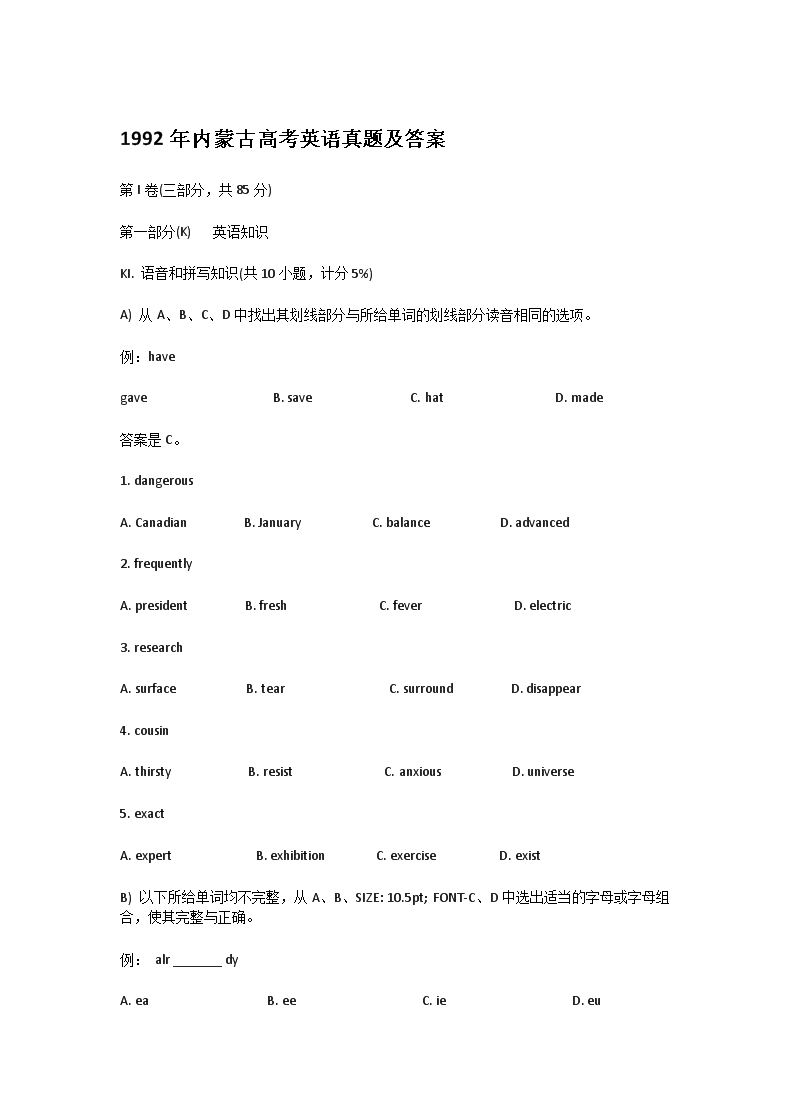 【文档预览】 无忧考网整理发布1992年内蒙古高考英语真题及答案(Word版),前五页预览如下: