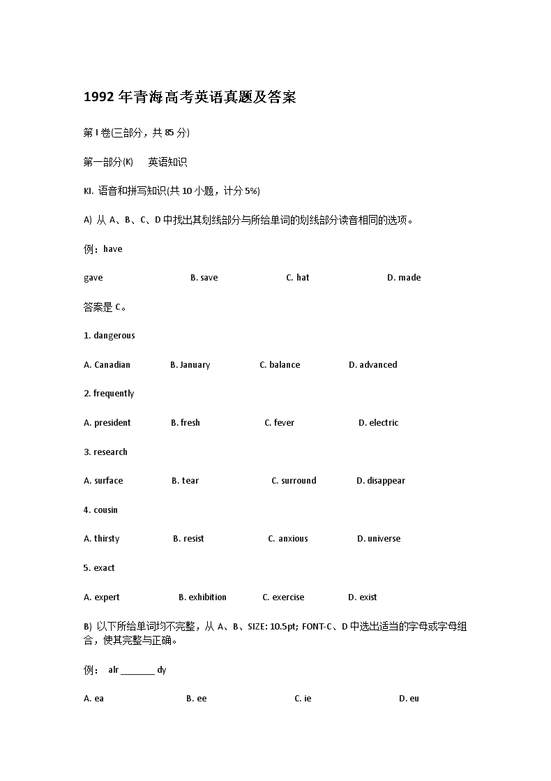 【文档预览】 无忧考网整理发布1992年青海高考英语真题及答案(Word版),前五页预览如下: