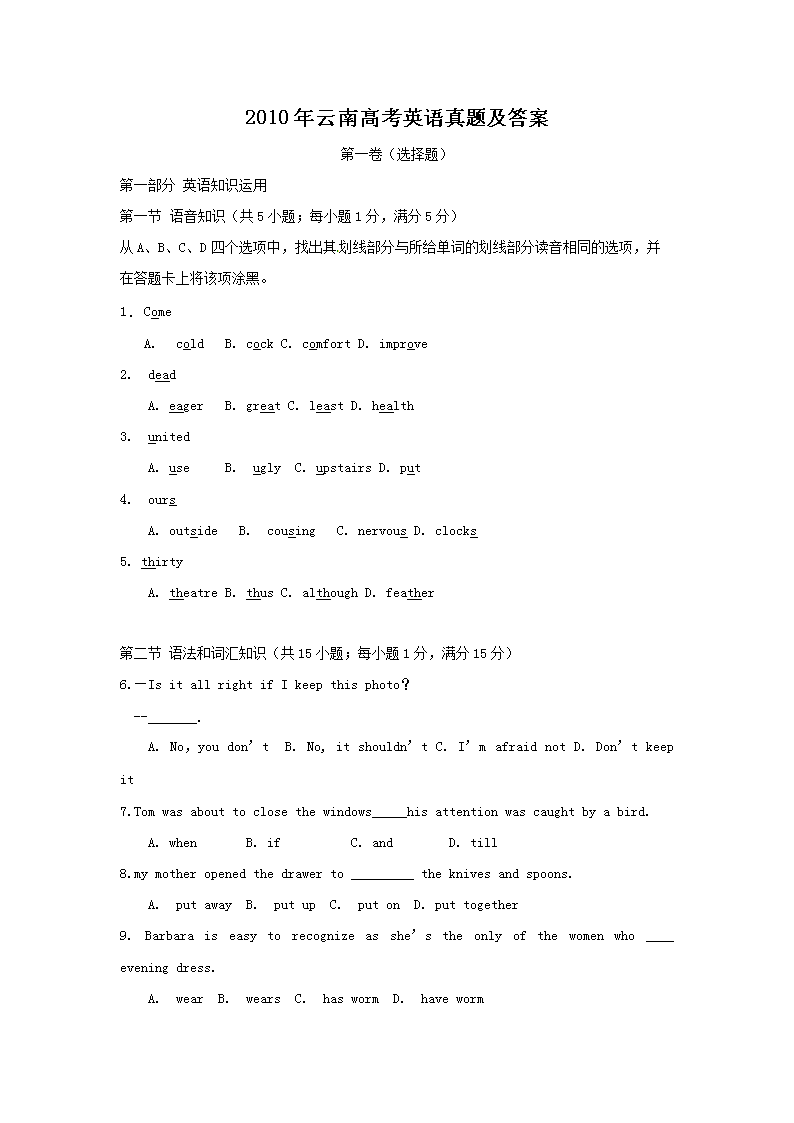【文档预览】 无忧考网整理发布2010年云南高考英语真题及答案(Word版),前五页预览如下: