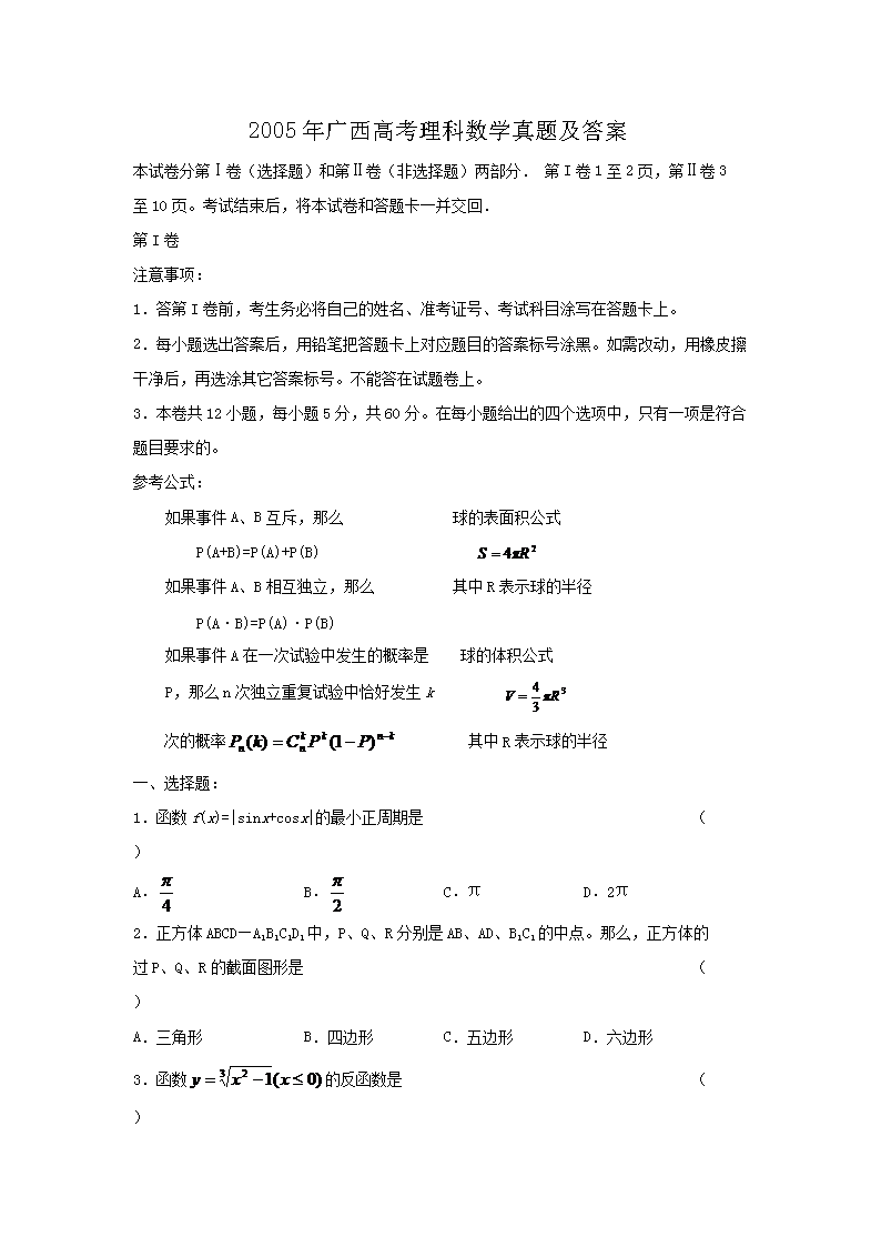 【文档名称】 2005年广西高考理科数学真题及答案(Word版).doc