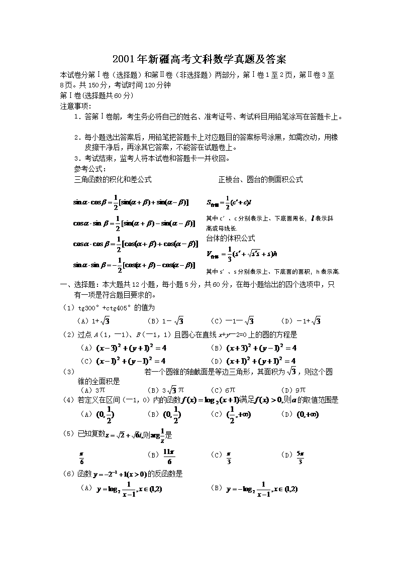 【文档预览】 无忧考网整理发布2001年新疆高考文科数学真题及答案(Word版),前五页预览如下: