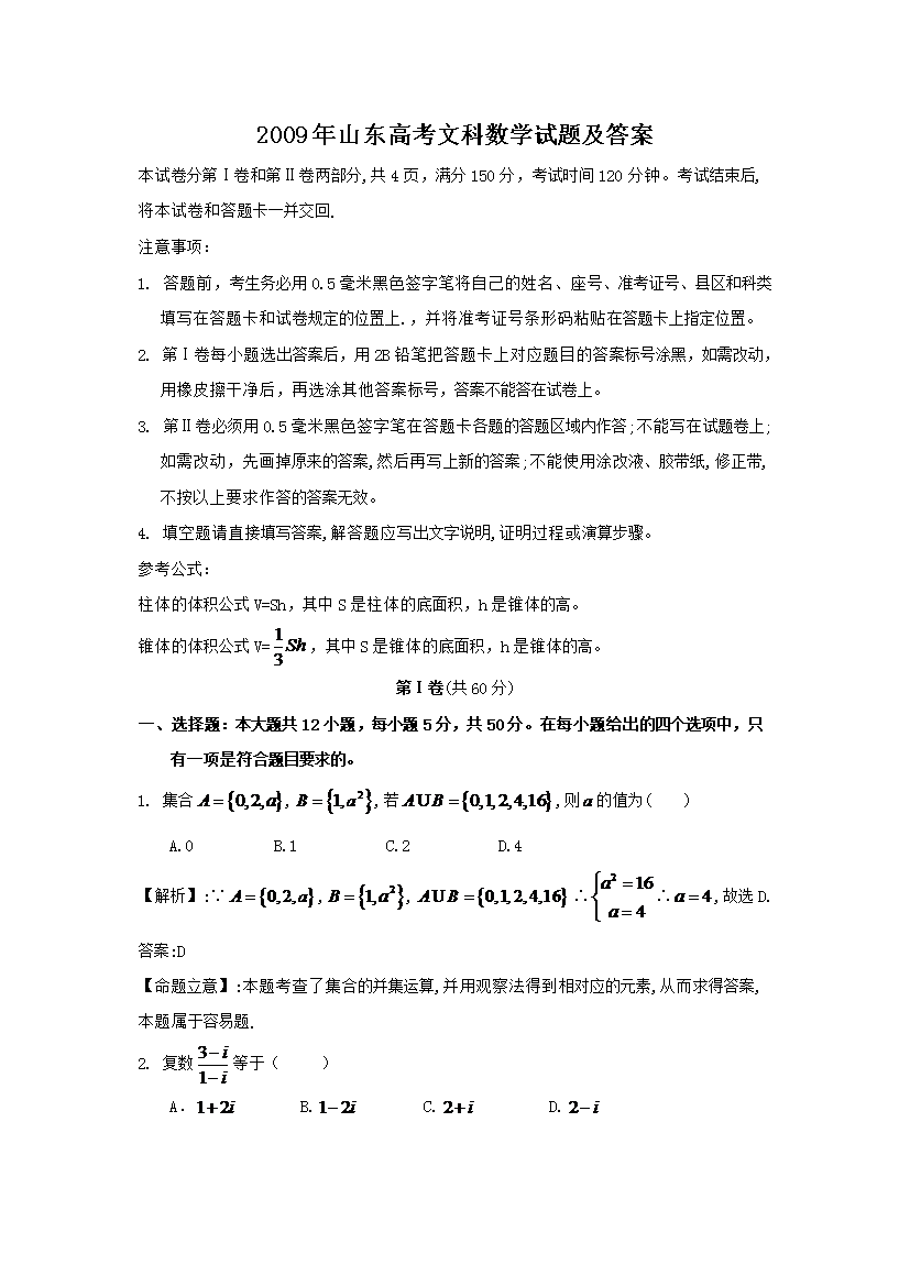 【文档名称】 2009年山东高考文科数学试题及答案(Word版).doc