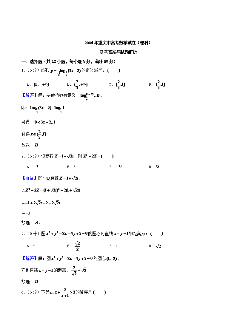 【文档名称】 2004年重庆高考理科数学真题及答案(Word版).doc