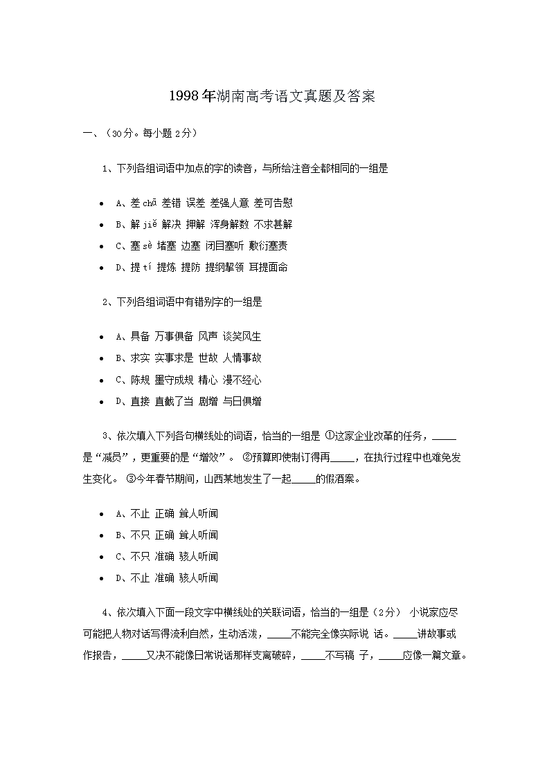 【文档名称】 1998年湖南高考语文真题及答案(Word版).doc
