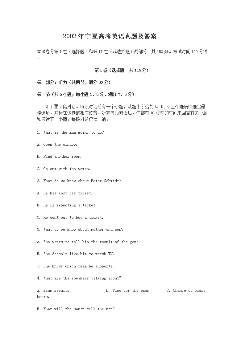 【文档预览】 无忧考网整理发布2003年宁夏高考英语真题及答案(Word版),前五页预览如下: