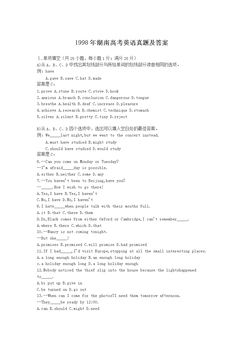 【文档名称】 1998年湖南高考英语真题及答案(Word版).doc