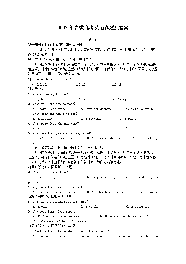 【文档名称】 2007年安徽高考英语真题及答案(Word版).doc